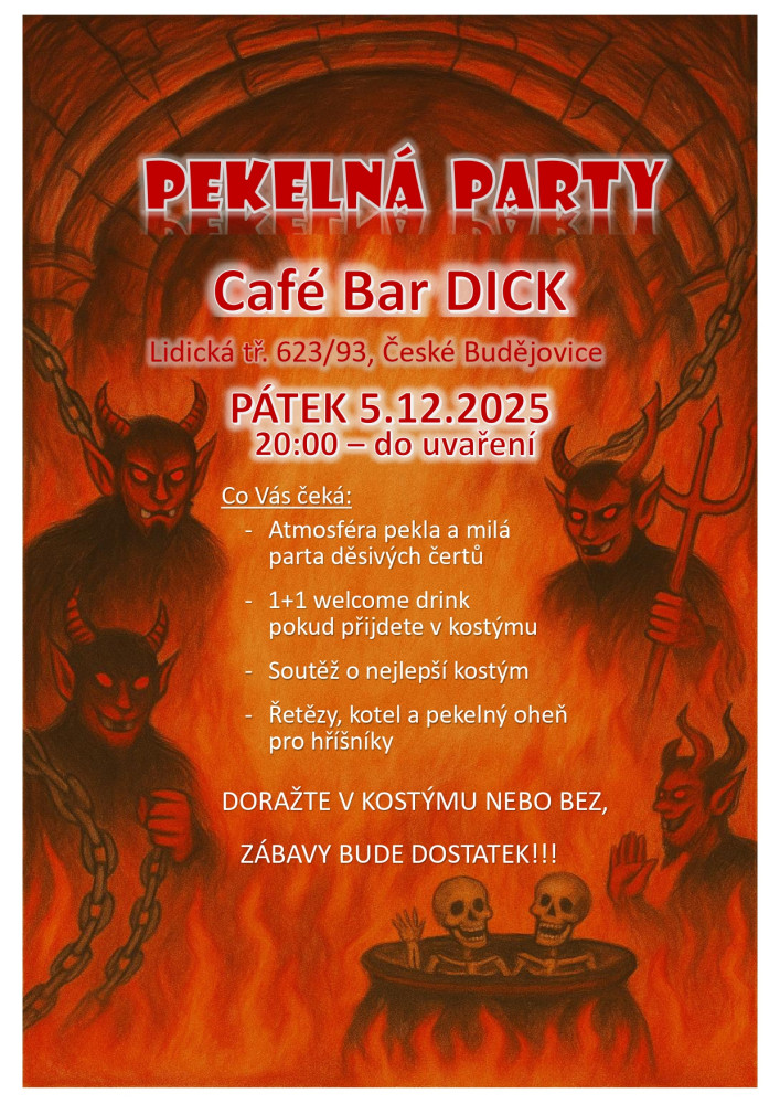 Tématický večírek v baru CAFFE BAR DICK, pro širokou veřejnost. Vstup zdarma, pro hosty v masce 1+1 zdarma welcome drink, dle aktuálního lístku akce. Bude se vyhlašovat nejlepší kostým. Vhodné i pro hosty bez kostýmu, kteří se chtějí pobavit a seznámit.