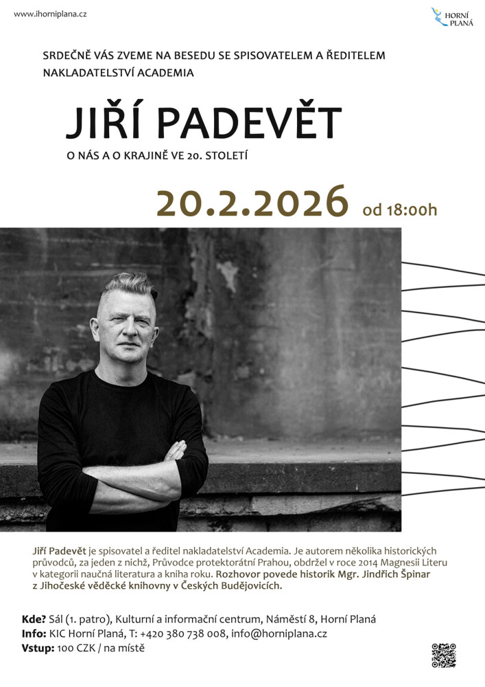 Beseda se spisovatelem a nakladatelem Jiřím Padevětem o proměnách krajiny a společnosti ve 20. století. Rozhovor vede historik Jindřich Špinar z Jihočeské vědecké knihovny v Českých Budějovicích. Vstupné činí 100 Kč.