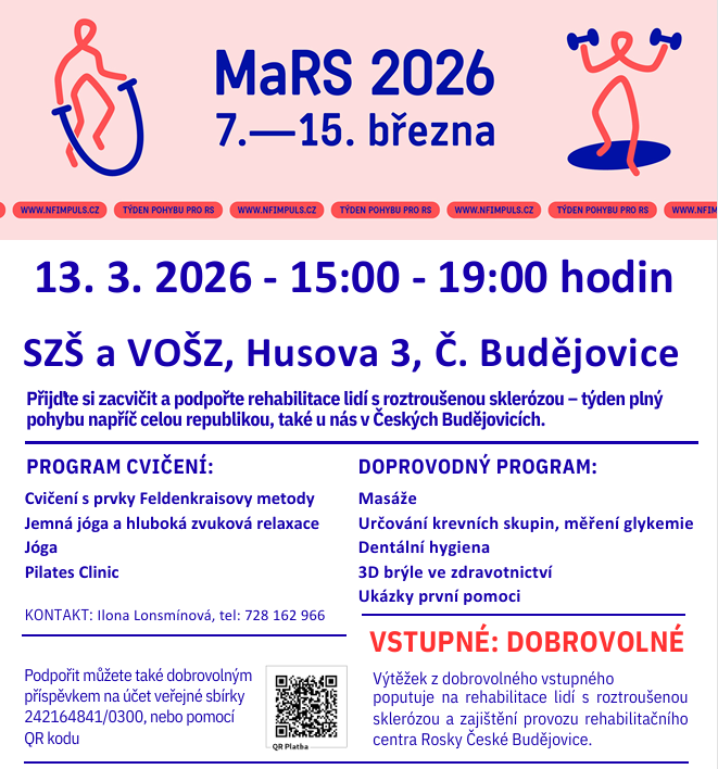 V Budějovicích se uskuteční benefiční akce MaRS – týden pohybu pro RS, která propojuje sportovní aktivity s podporou lidí s roztroušenou sklerózou. Program proběhne od 7. do 15. března a vyvrcholí v pátek 13. března charitativním během a cvičebními lekcemi pro veřejnost.