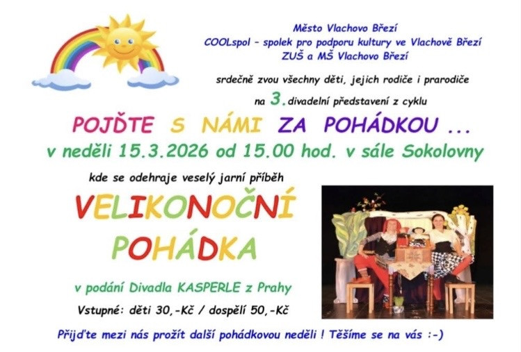 Divadelní představení pro děti s názvem Velikonoční pohádka je součástí cyklu POJĎTE S NÁMI ZA POHÁDKOU. Veselý jarní příběh v podání pražského Divadla KASPERLE přináší pohádkovou atmosféru inspirovanou velikonočními tradicemi. Představení je určeno především dětem, ale také jejich rodičům a prarodičům. Koná se v sále Sokolovny ve Vlachově Březí.