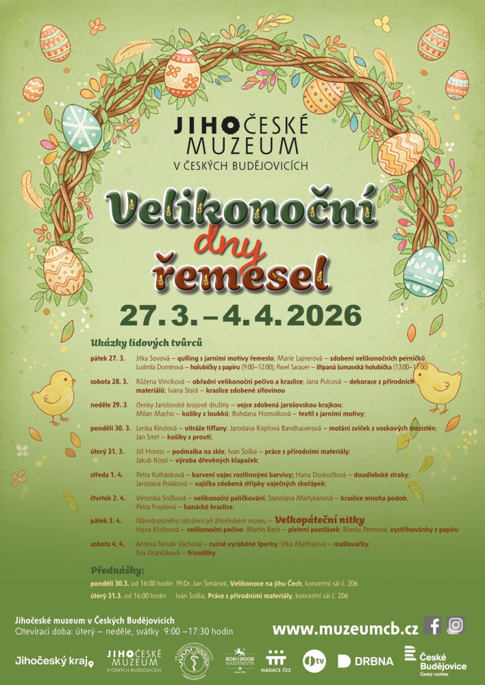 V Jihočeském muzeu se uskuteční Velikonoční dny řemesel, které nabídnou ukázky tradičních i současných rukodělných technik. Návštěvníci se mohou seznámit s výrobou kraslic různými způsoby, pečením obřadního pečiva nebo tvorbou jarních dekorací. Součástí programu budou také moderní výtvarné postupy, například quilling či vitráže Tiffany. Akce doplní tematické přednášky zaměřené na velikonoční tradice a lidovou tvorbu. Ukázky řemesel probíhají každý den od 9:00 do 17:30, přednášky začínají vždy od 16:00 hodin.