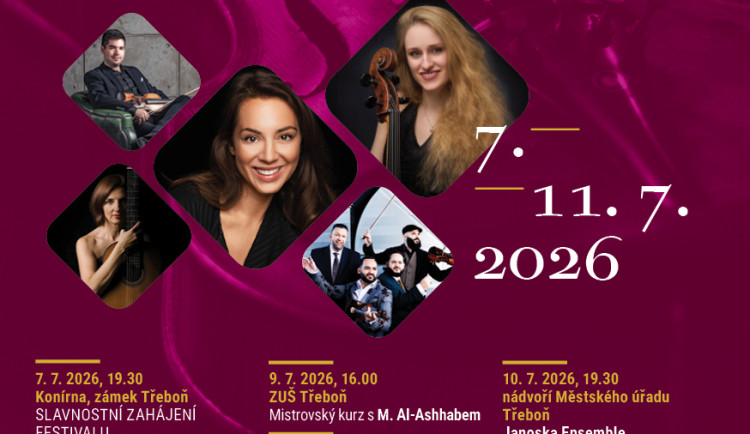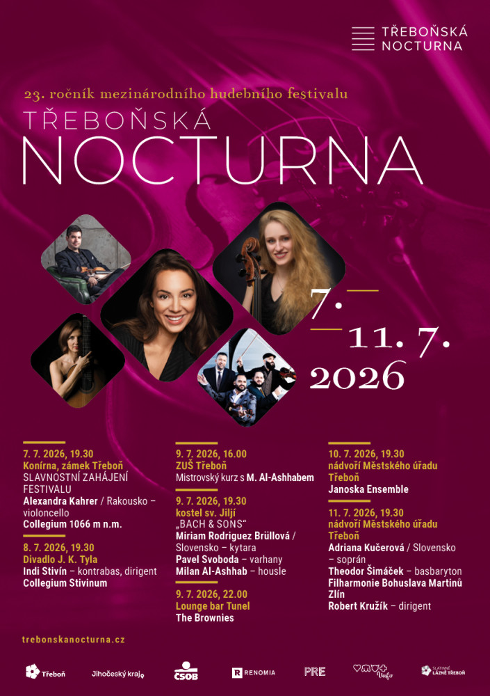 Letní hudební festival Třeboňská nocturna už od roku 2004 oživuje historické centrum Třeboně koncerty, které propojují klasickou hudbu s dalšími žánry. Akce láká na neformální atmosféru a spojení kvalitního umění s prostředím města, jako je zámecká konírna, místní divadlo, kostel sv. Jiljí nebo nádvoří radnice. V rámci letošního programu se představí například soubor Janoska Ensemble, slovenská sopranistka Adriana Kučerová, Filharmonie Bohuslava Martinů Zlín, Indi Stivín či rakouská violoncellistka Alexandra Kahrer. Všechny koncerty začínají v 19:30 hodin. Přijďte si vychutnat letní Třeboň v doprovodu špičkových českých i zahraničních interpretů.