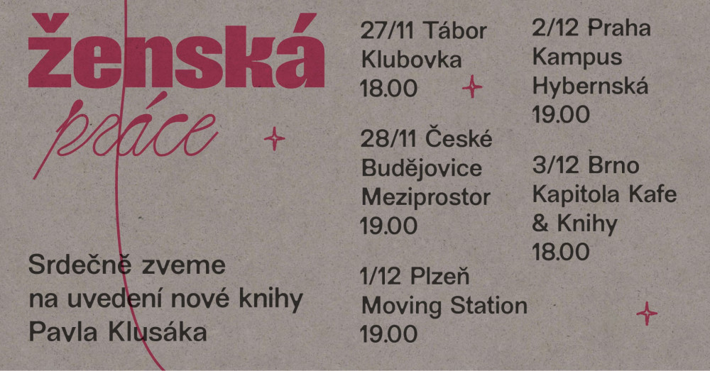 Projekce, hudba, čtení, diskuse a premiérový prodej nové knihy autora oceněného dvěma cenami Magnesia Litera. „Historie popu vyprávěná ženami“ ŽENSKÁ PRÁCE vznikla na základě úspěšného stejnojmenného audioseriálu. Knihu lze vnímat jako feministickou výpověď i prostě jako pořádný ponor do skvělé hudby, která nás provází životem.