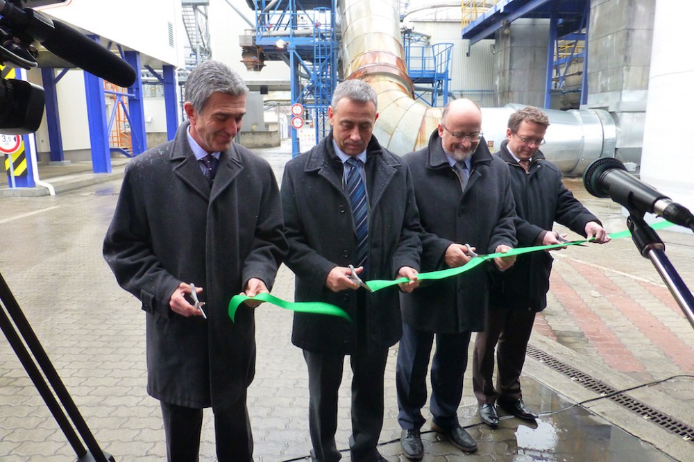 Nové odsíření Teplárny České Budějovice slavnostně zprovoznili šéf firmy Miroslav Houfek, František Paulík, výrobní ředitel Tenzy Brno, českobudějovický primátor Jiří Svoboda a Jan Kříž, náměstek ministra životního prostředí