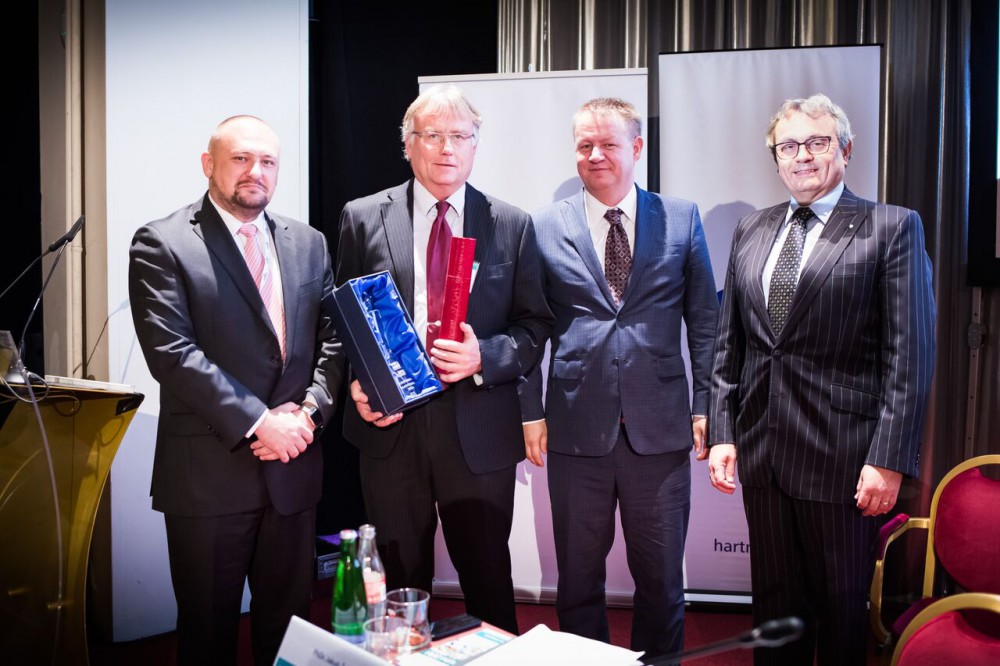 Zleva prezident Unie zaměstnavatelských svazů Jiří Horecký, ředitel strakonické nemocnice Tomáš Fiala, ministr zdravotnictví Svatopluk Němeček a prezident Hospodářské komory ČR Vladimír Dlouhý