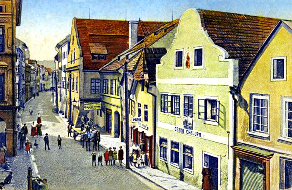 Česká ulice v dopoledním slunci na začátku 20 století v době režimu c. k. s původně zájezdní formanskou hospodou U České chalupy.