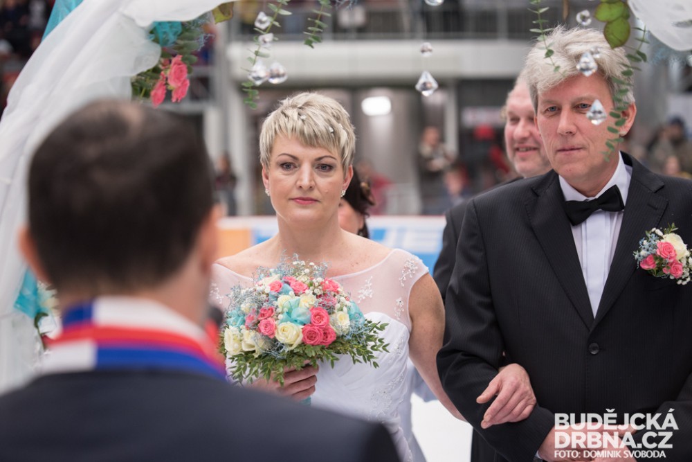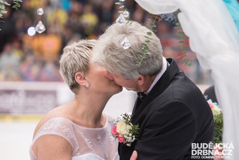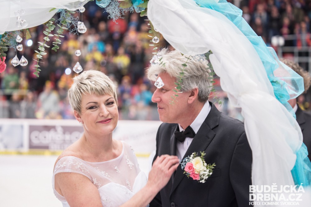 VIDEO: Přestávka plná emocí. Svatbu na ledě viděla vyprodaná Budvar aréna
