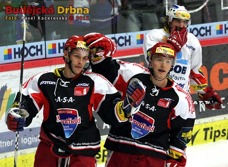 Ojedinělý obrázek tohoto utkání - Rudolf Červený blahopřeje střelci první domácí branky Lukáši Květoňovi