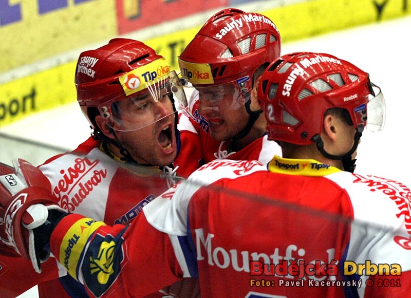 Upřímná radost Davida Kuchejdy po rozhodujícím gólu Motoru, vpravo Roman Pšurný a František Ptáček