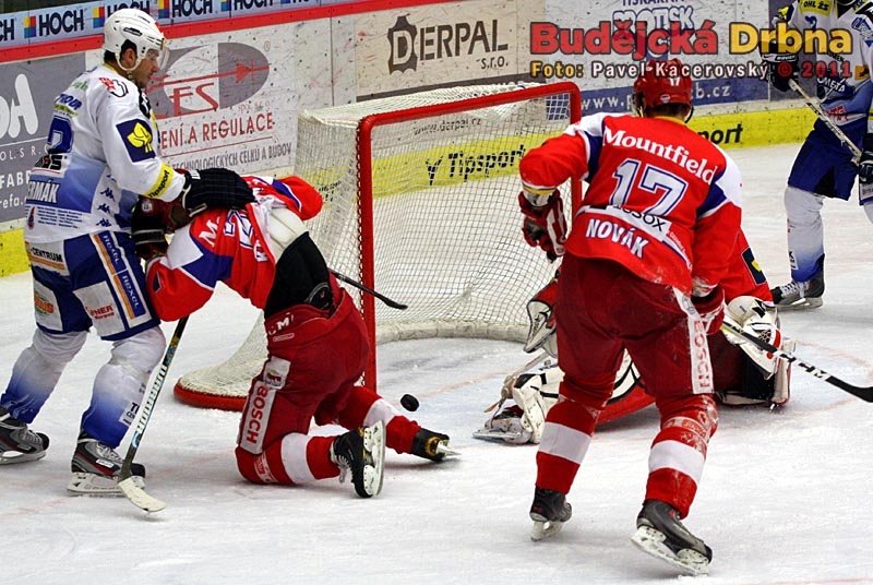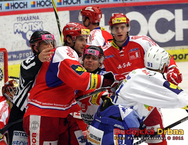 Jeden z důrazných soubojů před Kovářovou brankou, vlevo Čermák tahá za dres Kašpaříka
