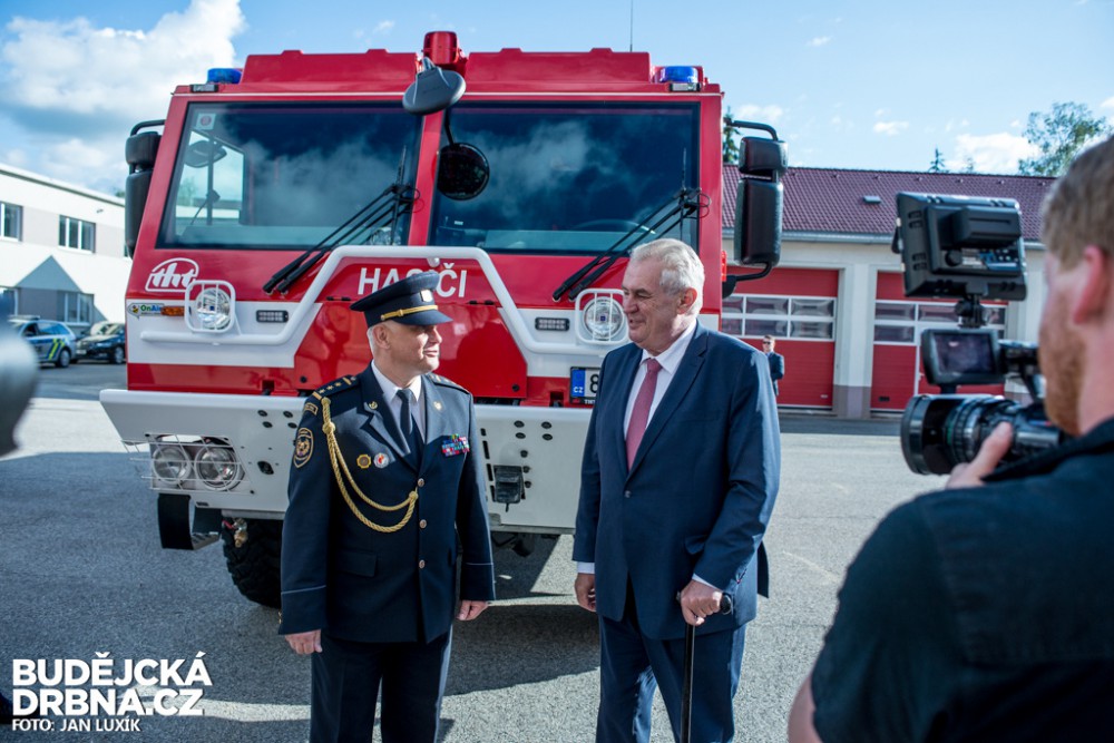 Na závěr prvního dne prezidentské návštěvy zavítal Zeman k budějckým hasičům