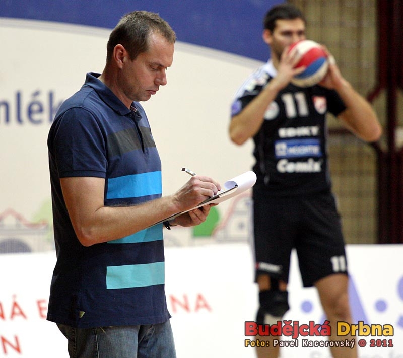 Trenér Jihostroje Jan Svoboda, v pozadí Radek Motys