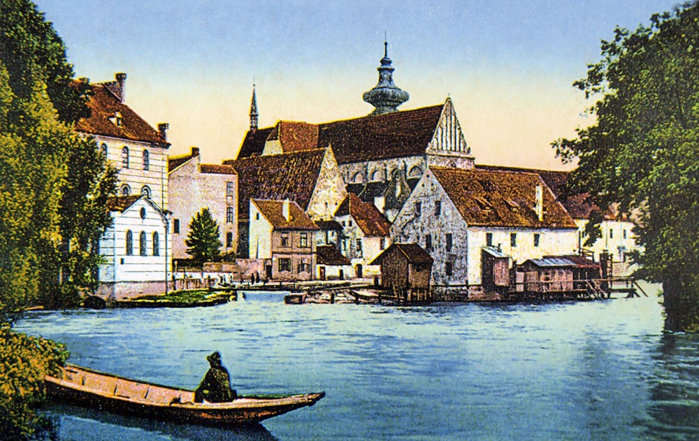 Vltava s vodou Malše proti proudu mezi Předním a Malým mlýnem proti proudu v období c. k.