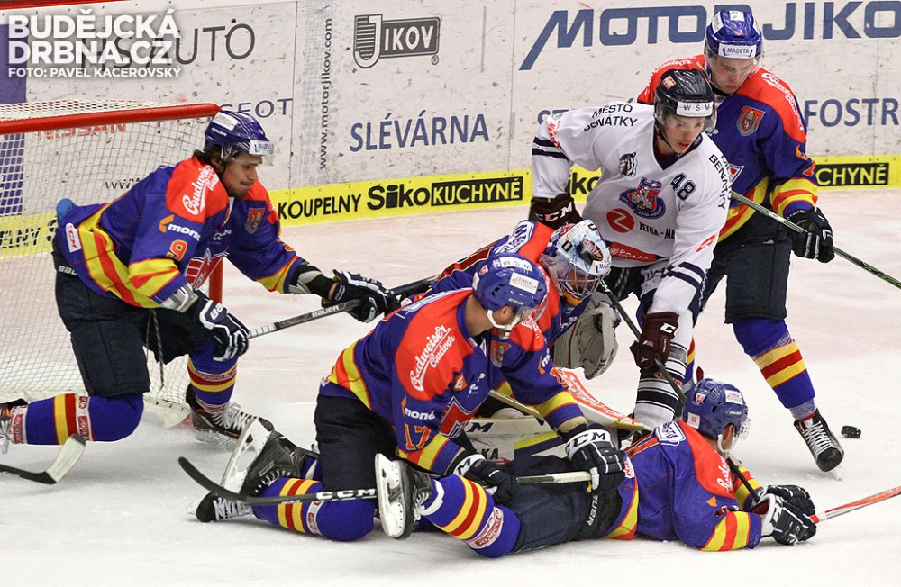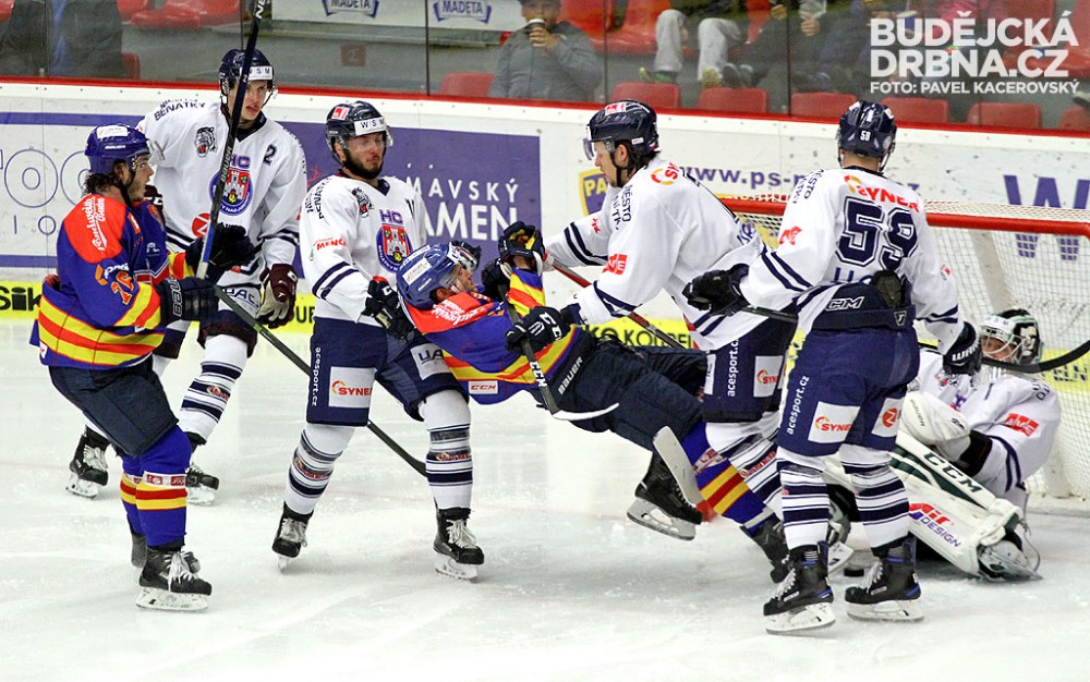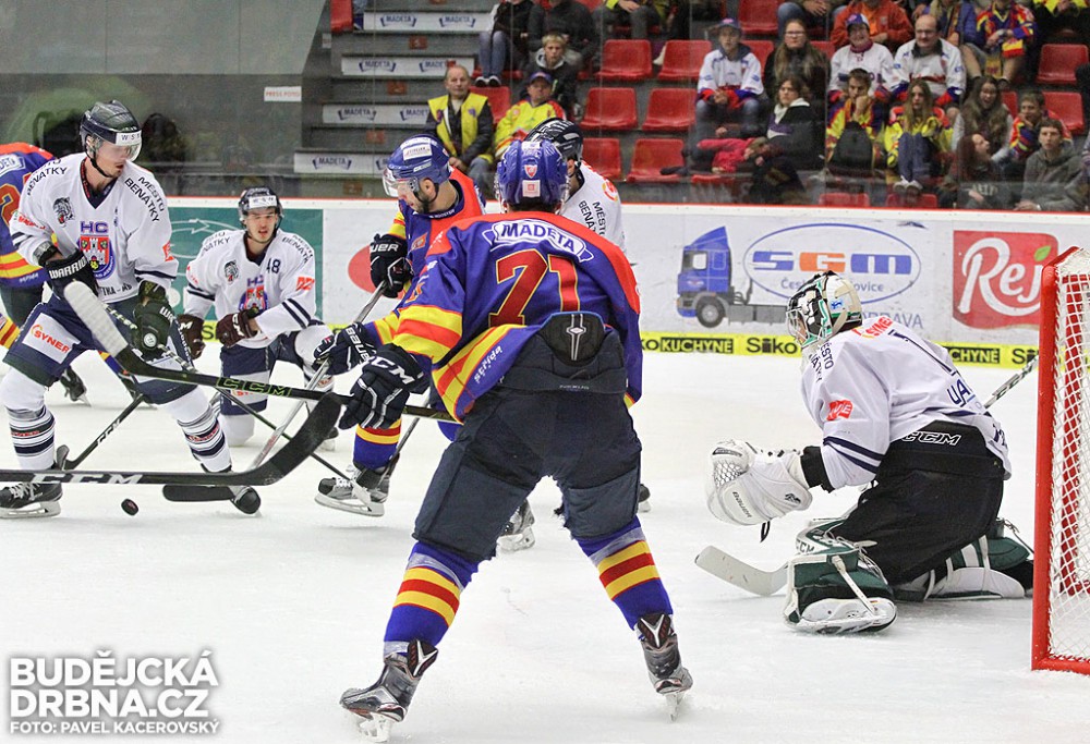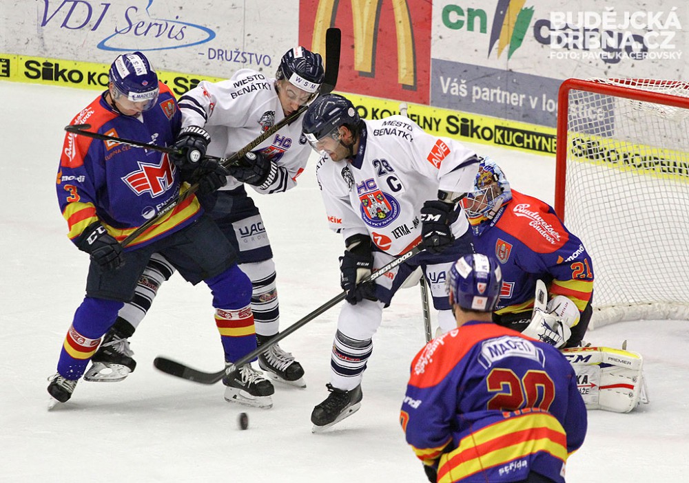 Ján Mucha před klecí Motoru brání Hrníčka, kapitán Benátek Plodek je ale nekrytý