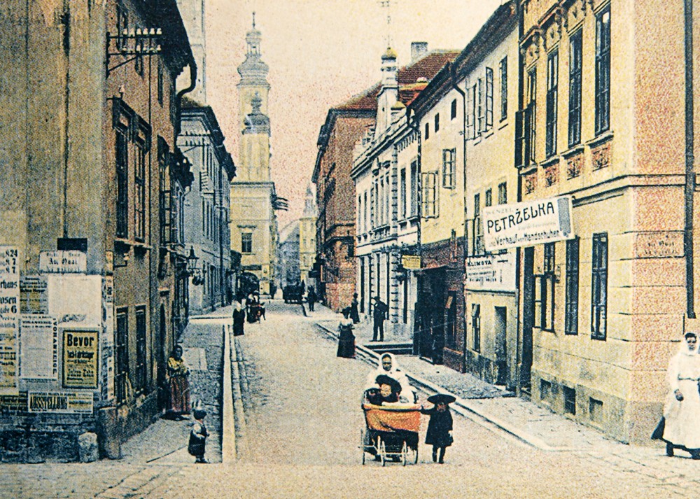 Biskupská ulice před rokem 1922 v pohledu z mostu směrem k náměstí