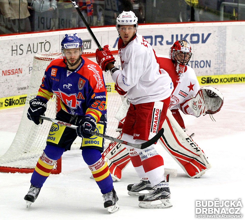 Proti Slavii se gólově prosadil i Tomáš Nouza (na snímku před hostujícím gólmanem Frodlem bráněný Mihou Štebihem)