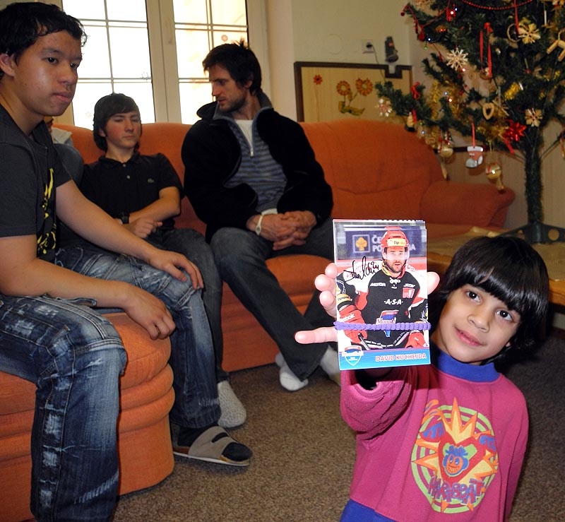 Holčička Andrea z Dětského domova Boršov ukazuje podepsanou kartičku Davida Kuchejdy. V pozadí Martin Podlešák
