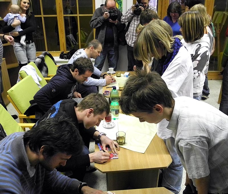 Hráči HC Mountfield Martin Podlešák (vepředu), Rudolf Červený, David Kuchejda a František Ptáček se podepisují dětem