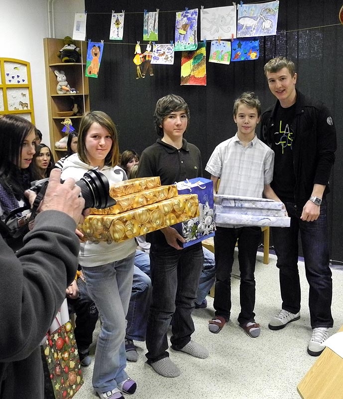 Rudolf Červený (na snímku zcela zpravo) předává dětem dárky od budějckého klubu