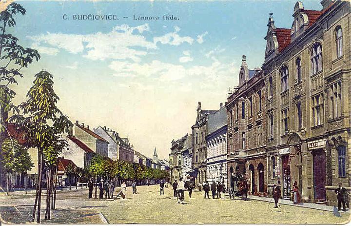 Lannova třída v období c. k. od Chelčického ulice směrem k městu. Vpravo na rohu Chelčického secesní dům z věžičkou z roku 1905