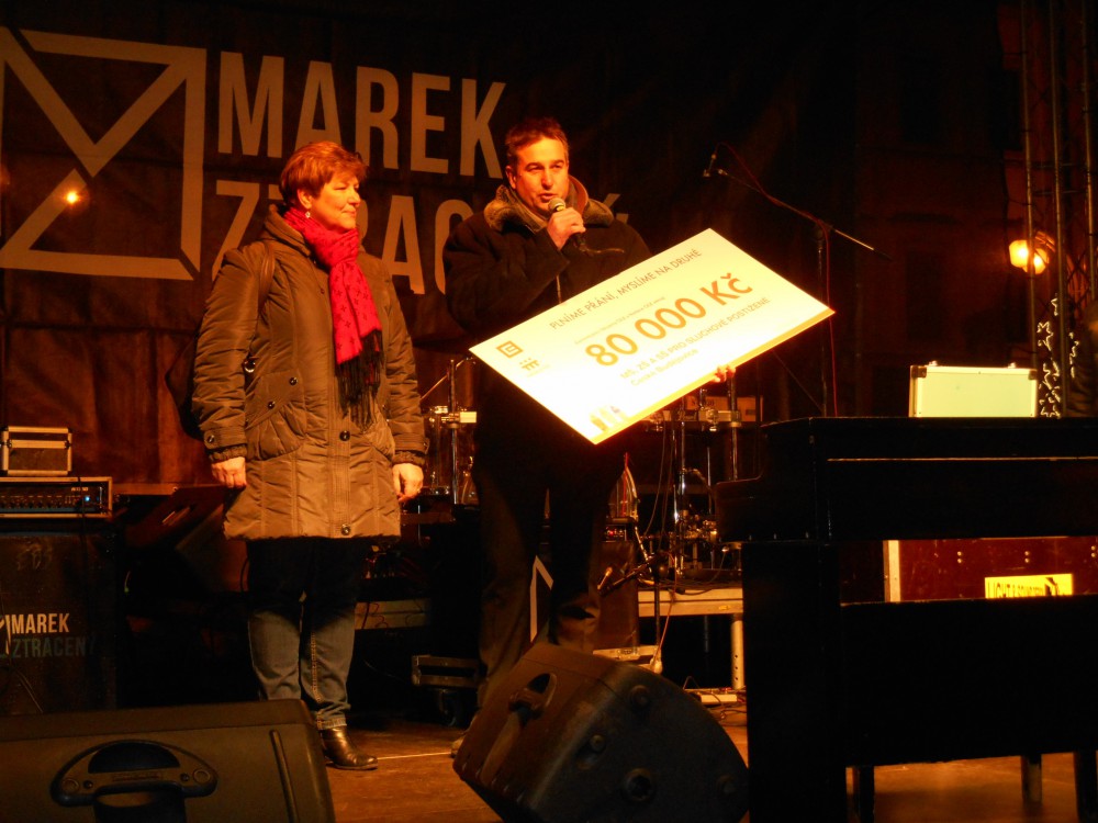 Před příletem anděla na budějovické náměstí předal vedoucí temelínské komunikace Petr Šuleř šek na 80 tisíc Ivaně Macíkové z Domova pro sluchově postižené