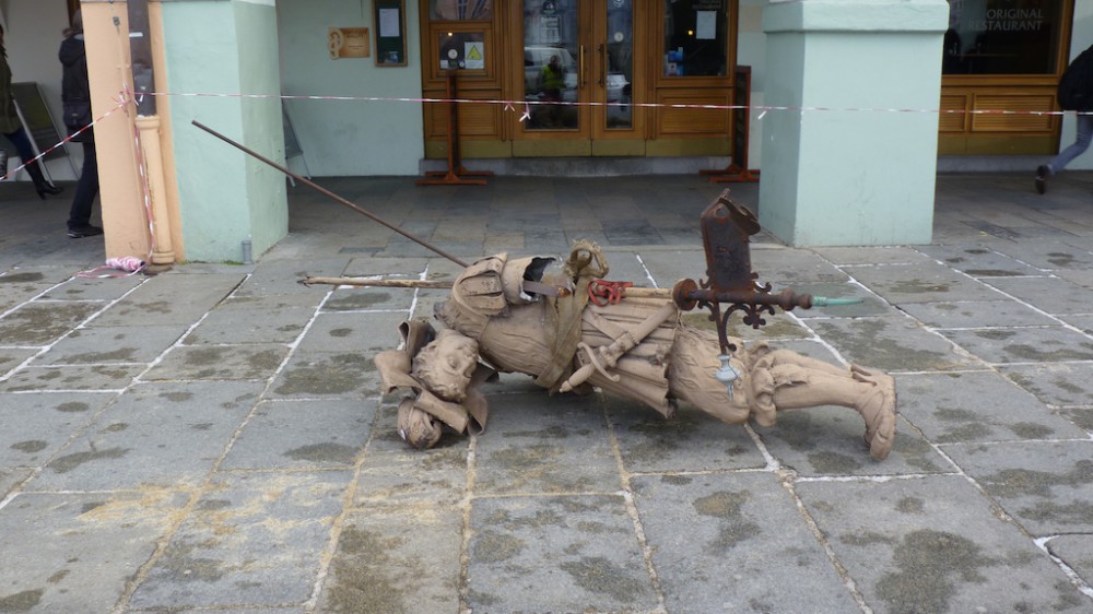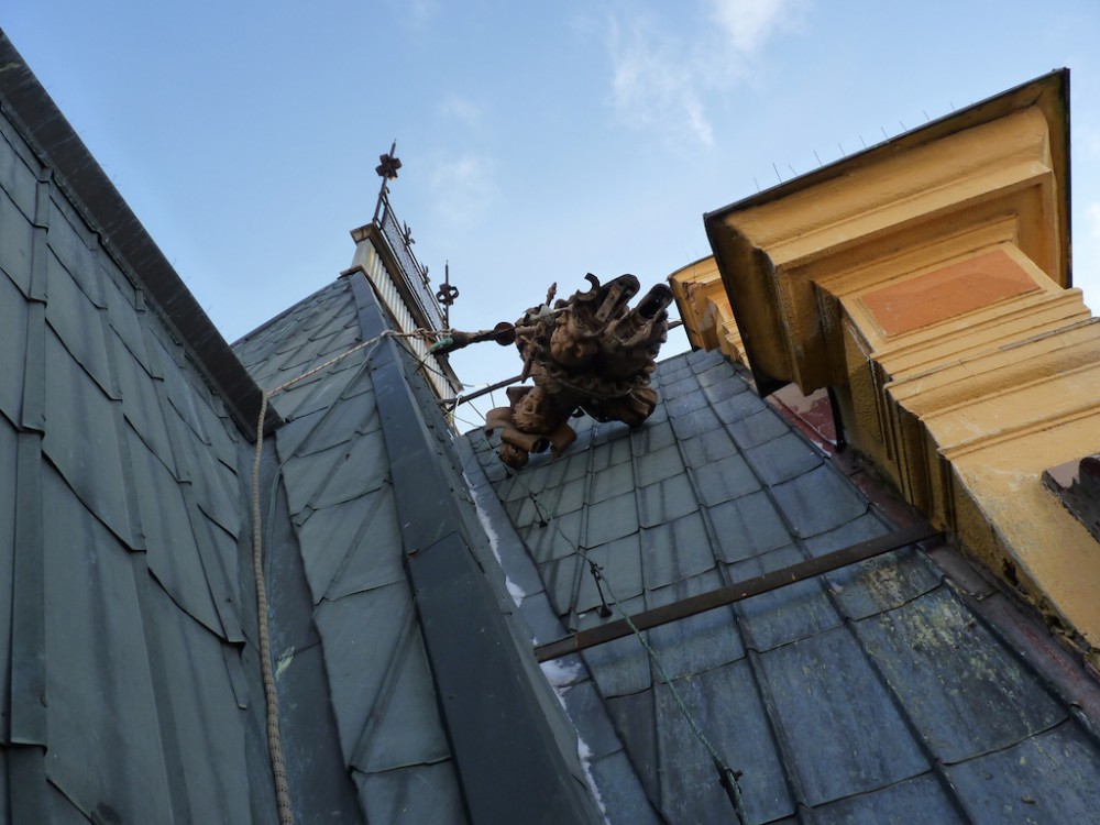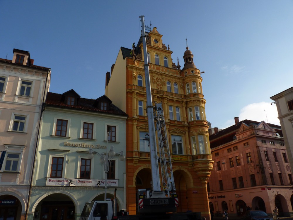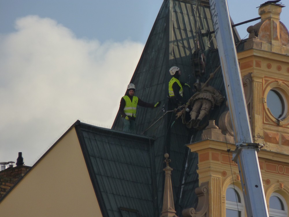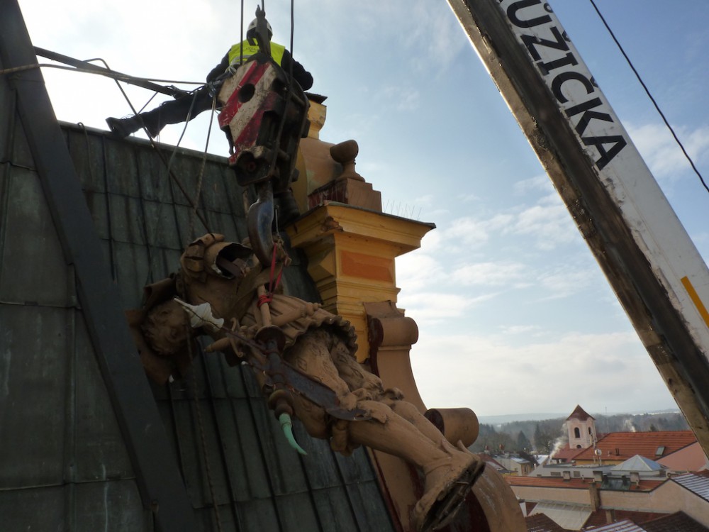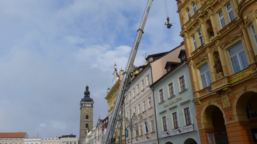 Vítr strhl metrákovou sochu z budovy na budějckém náměstí. Zachytila se na střeše