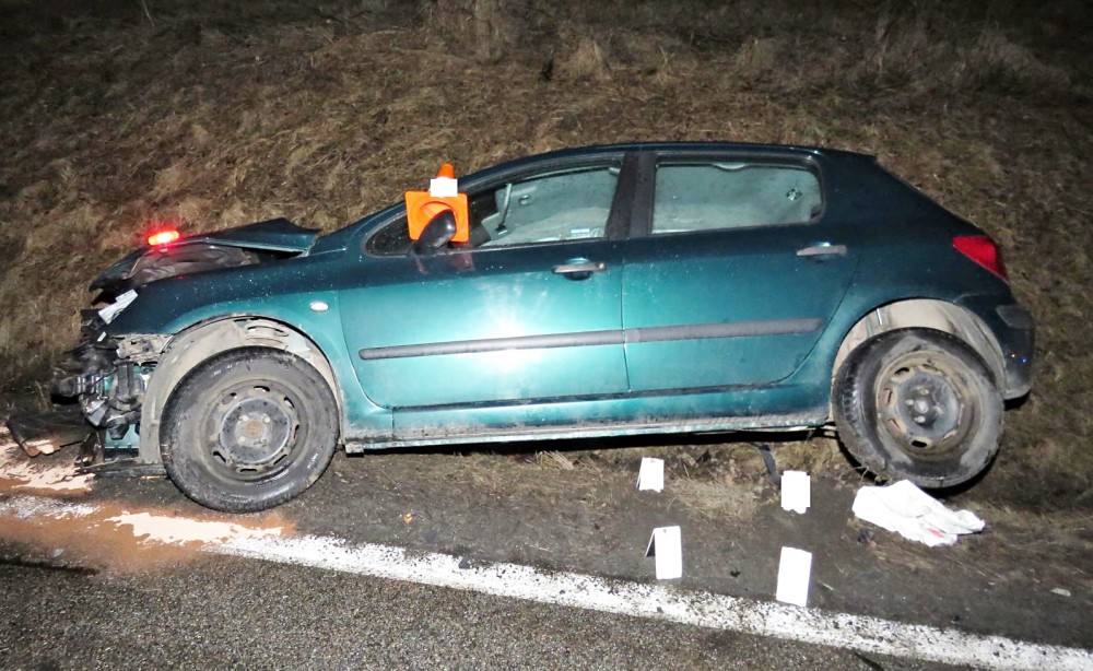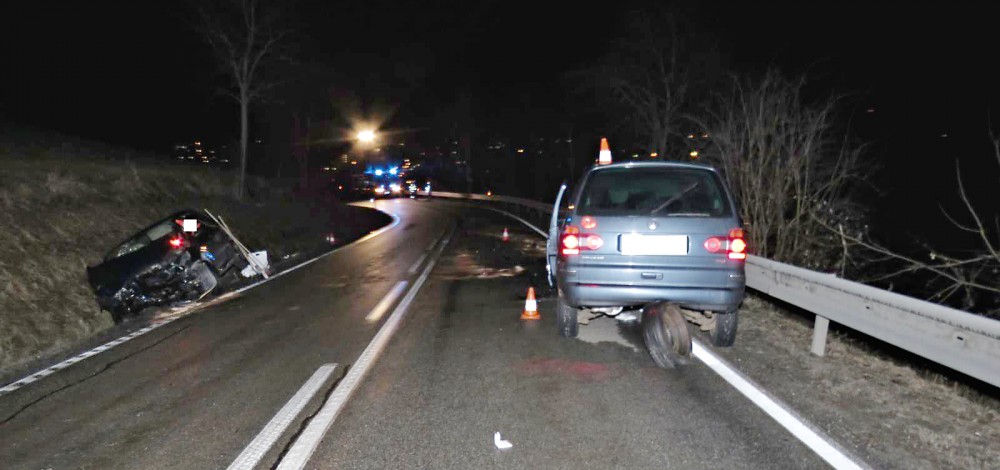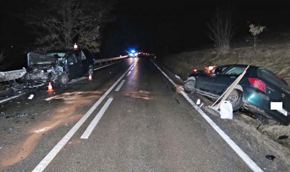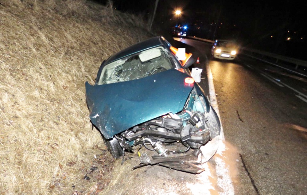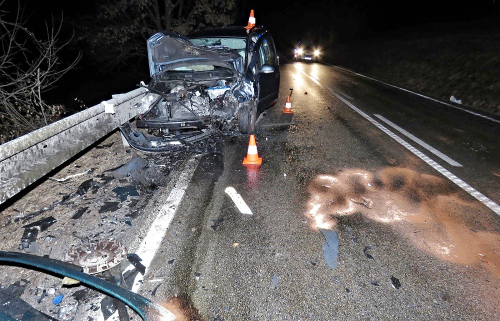 Řidič nezvládl průjezd zatáčkou, na mokré silnici dostal smyk a smetl protijedoucí auto. Těžce zranil čtyři lidi