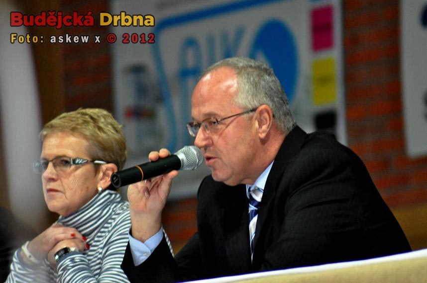 Zdeněk Velikovský, ředitel českobudějovické Krajské hygienické stanice, na veřejném jednání ve Sportovní hale
