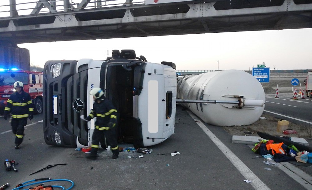 Převrácená cisterna na dálnici D3 u Tábora..