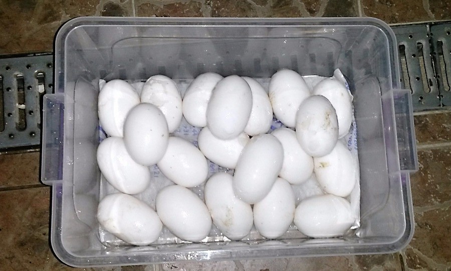 Vajíčka gaviála indického v příruční přenosce ihned po sběru.