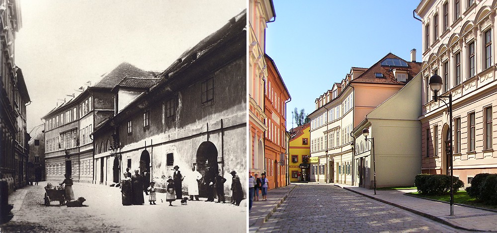 Vlevo solnice v České ulici kolem roku 1900, vpravo gymnázium v České 64.