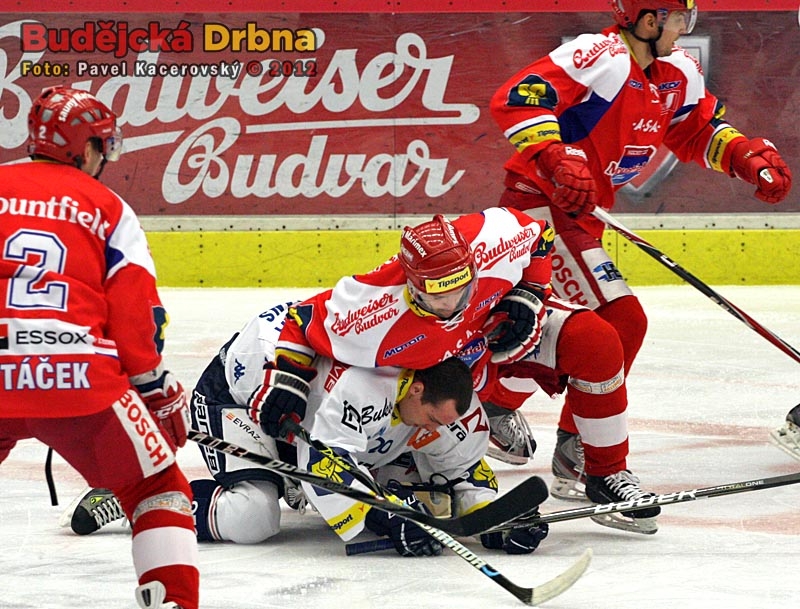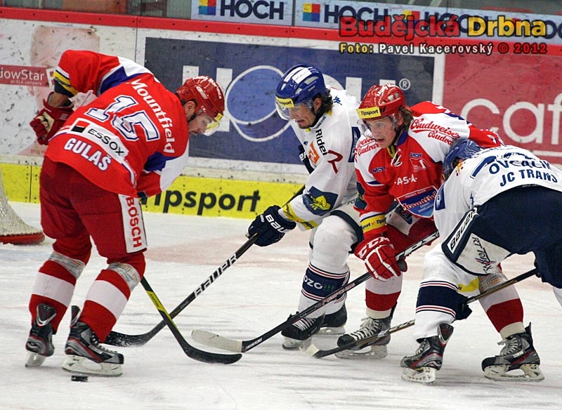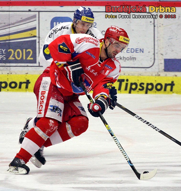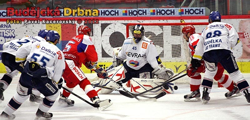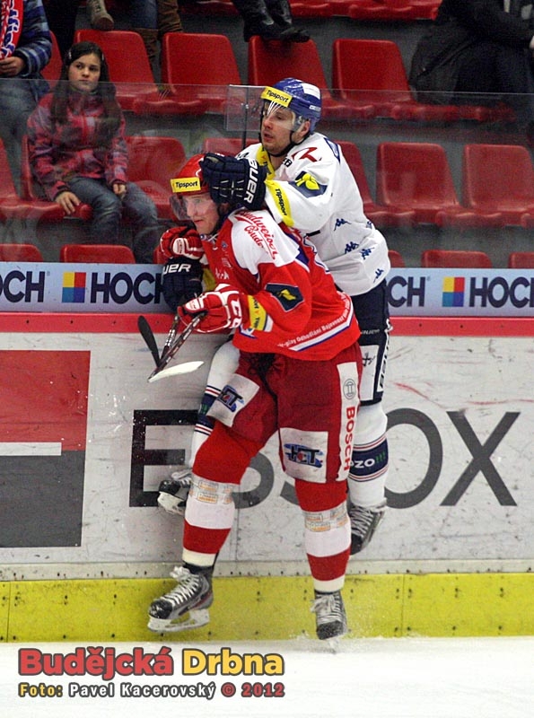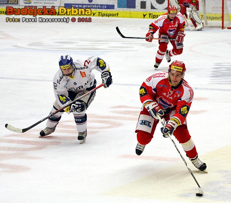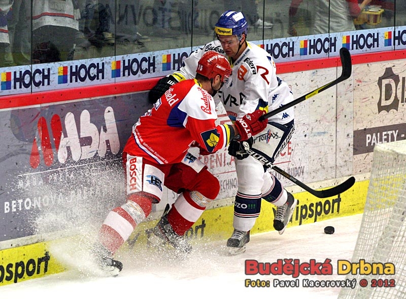 Centr první lajny Motoru Pavel Kašpařík před Tomášem Káňou