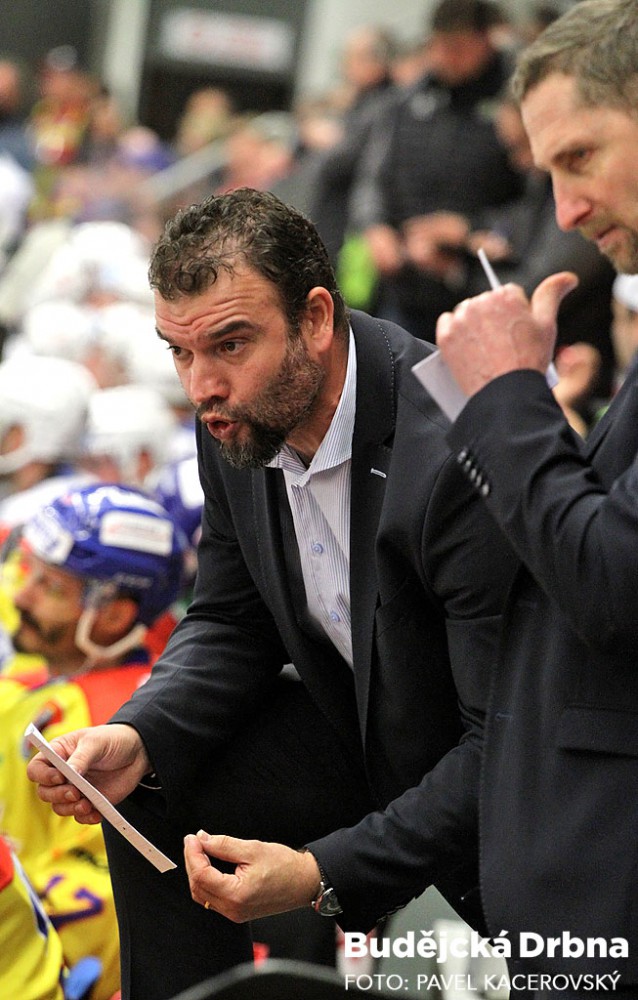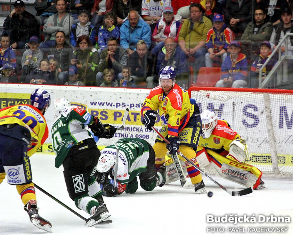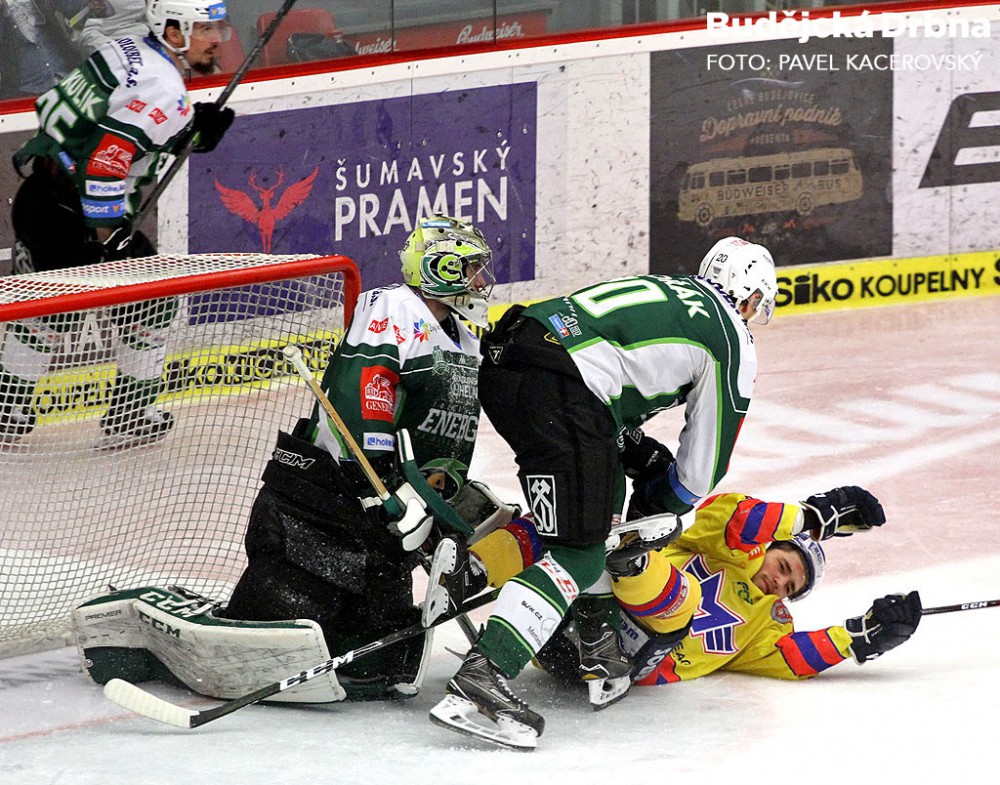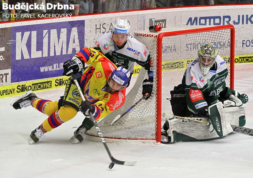 Jihočeši hráli pohledný ofenzivní hokej. Na snímku obchází Honzíkovu branku Filip Vlček, brání ho Denis Kindl