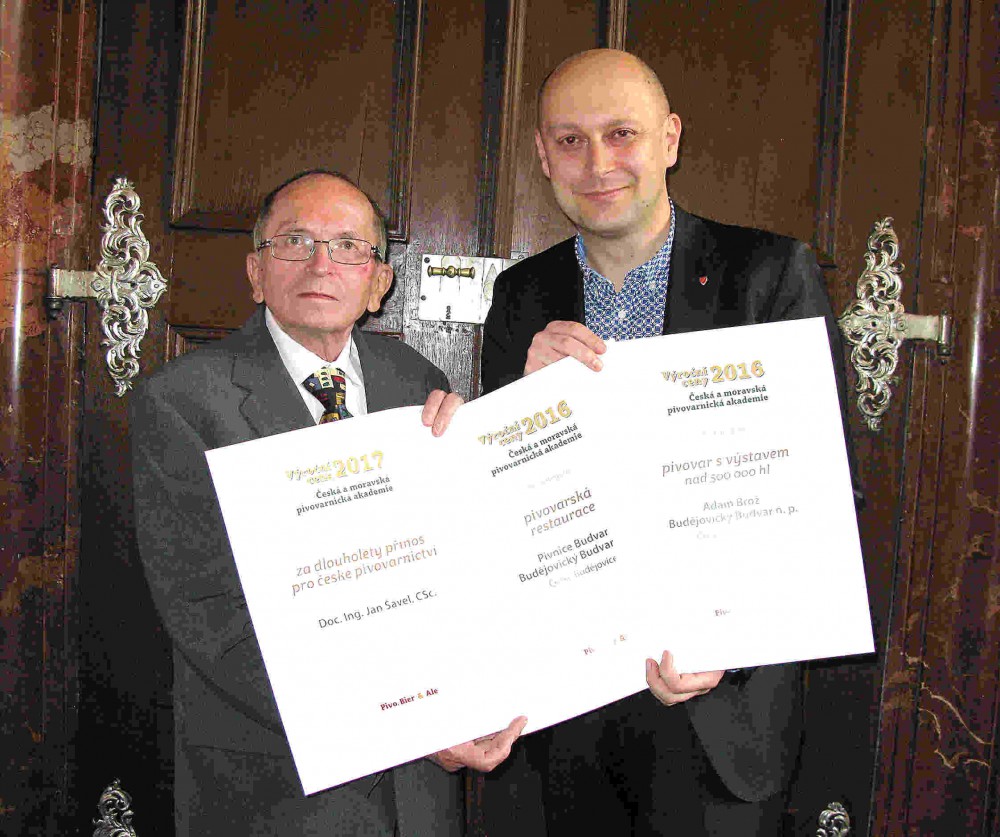Výroční ceny za rok 2016 získali sládek Budějovického Budvaru Adam Brož (vpravo), vedoucí výzkumu a vývoje Budějovického Budvaru Jan Šavel a pivnice Budvar.