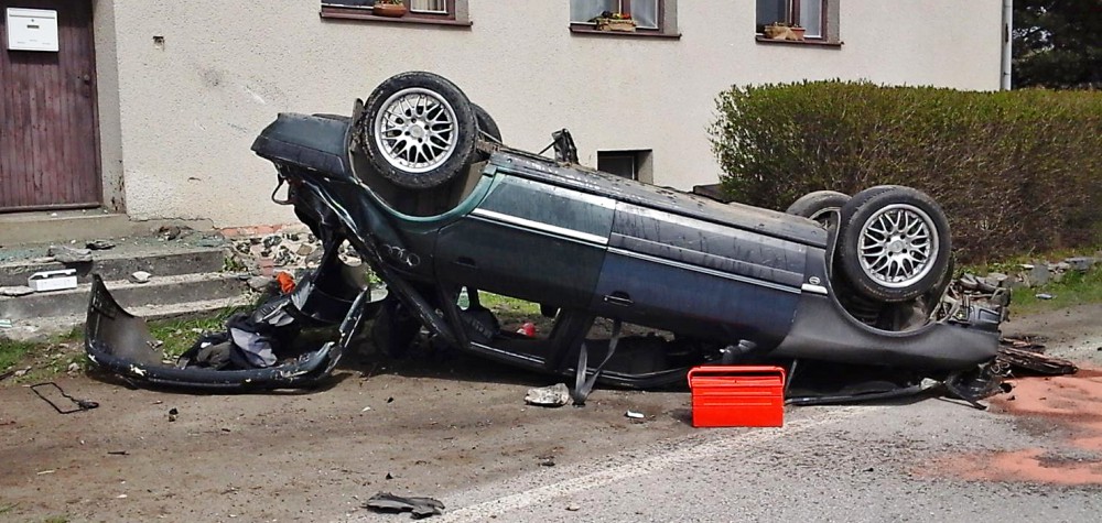 Řidič narazil s autem do schodů a převrátil ho na střechu