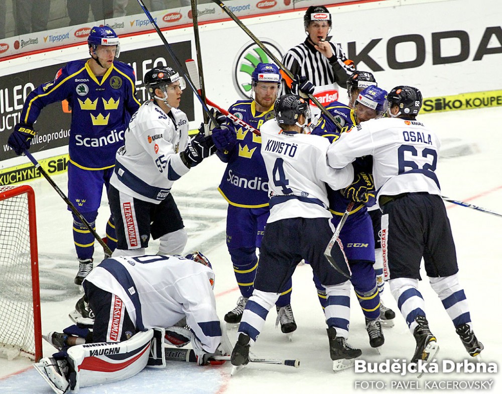 Vyostřený souboj u branky Finska. Vpravo střelec rozhodující branky Oskar Osala