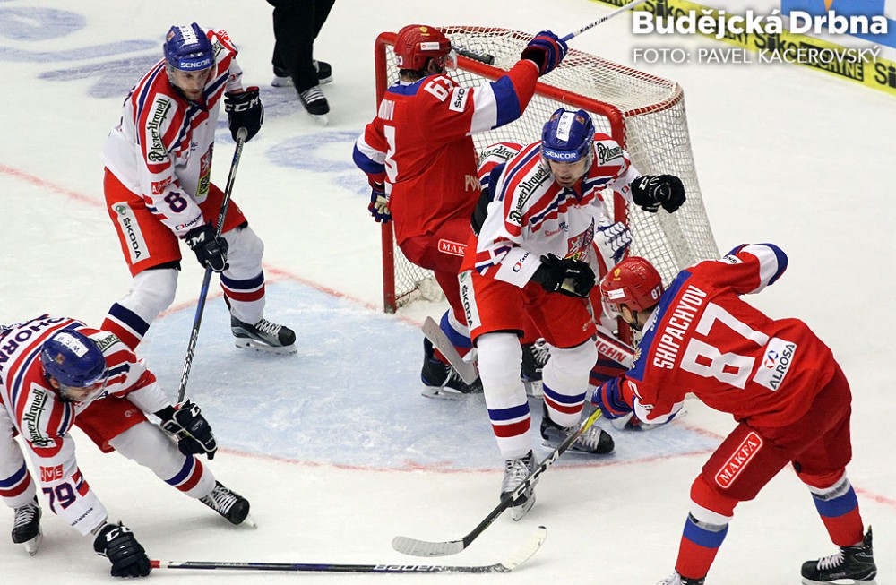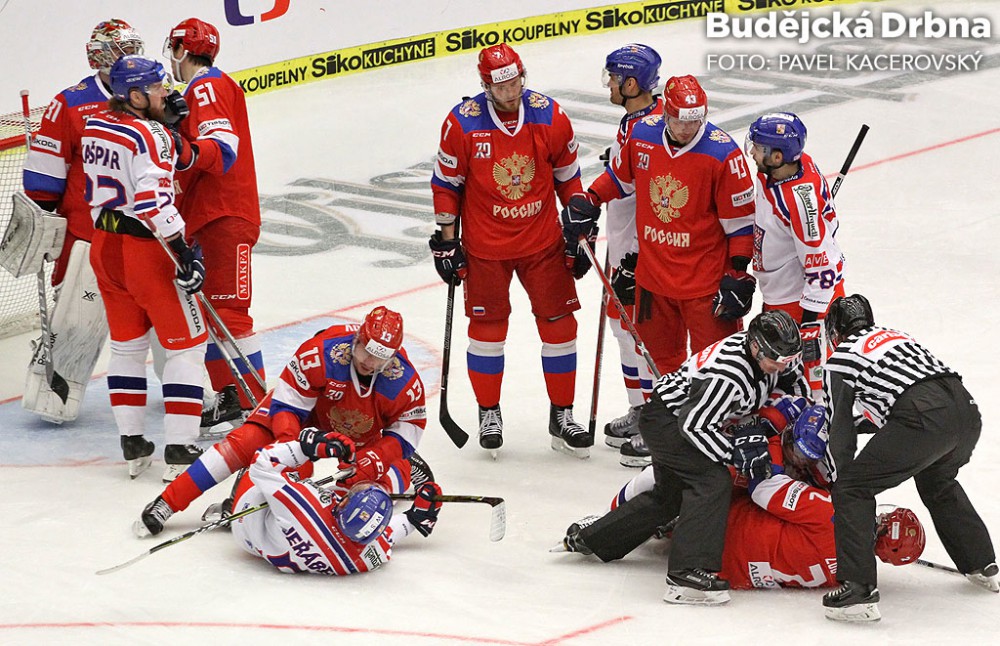 Nejlepším českým hráčem po utkání s Ruskem byl vyhlášen Jan Kovář, který jeden gól dal a na další nahrál. Na snímku obehrává Ivana Provorova