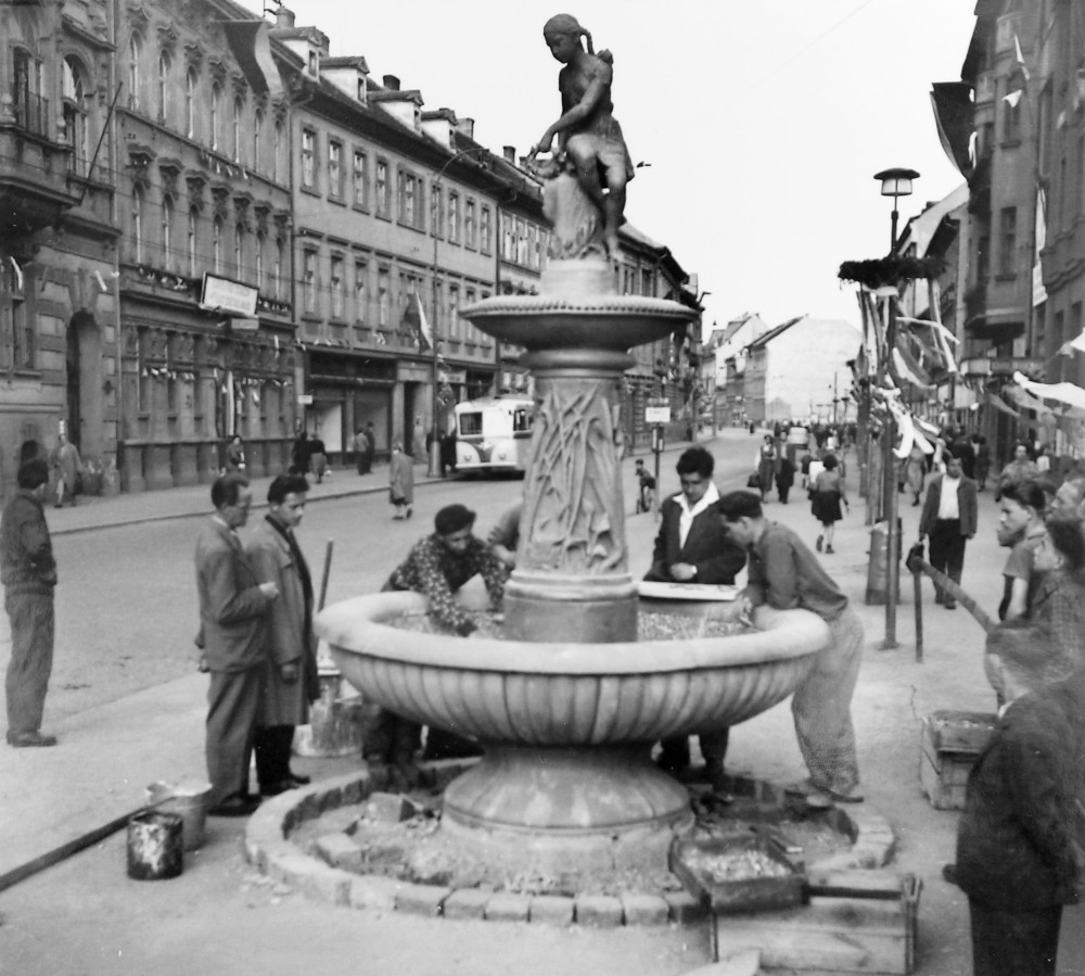Dokončování stavby kašny na Lannovce v roce 1955 poblíž kina Jas.