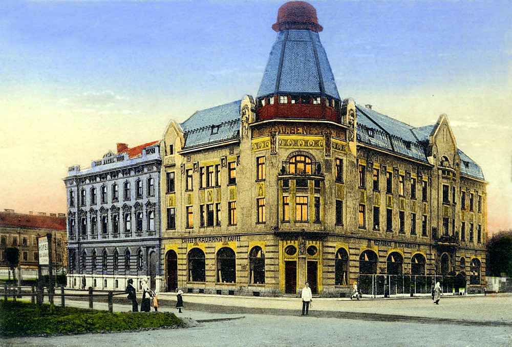 Grand Hotel V. Beneš na rohu Nádražní a Žižkovy po roce 1909. Dům v šedomodré fasádě je hotel International.