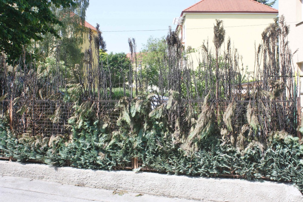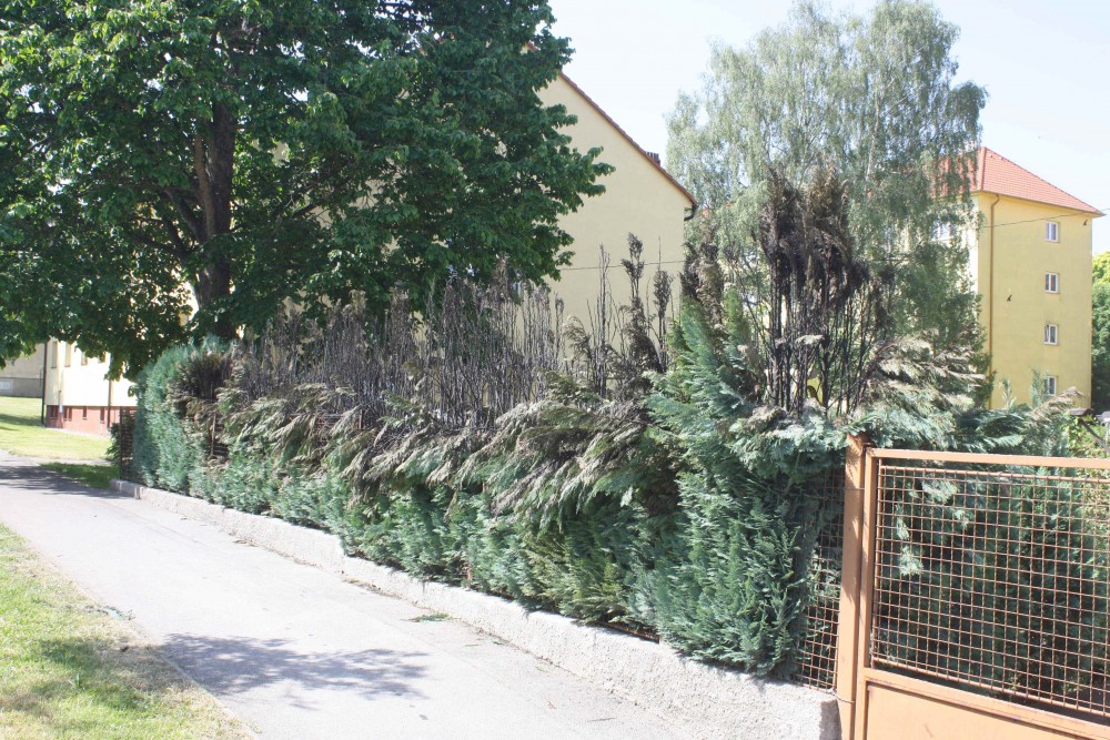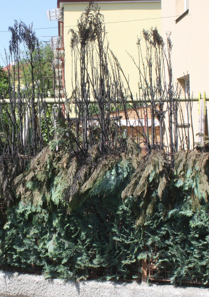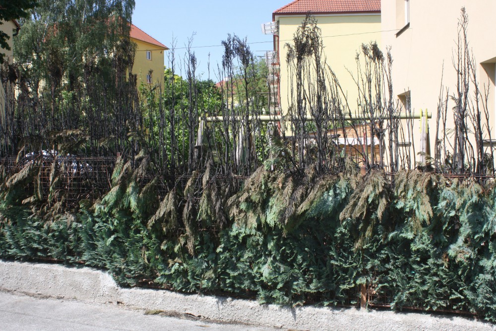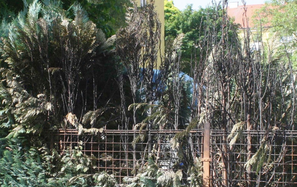 Žhář zapálil také vzrosté túje u domu v Pabláskově ulici v Českých Budějovicích.