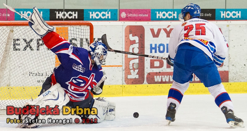 Výkony obou brankářů byly ozdobou prvního finálového utkání. Na snímku při zákroku táborský Zpěvák