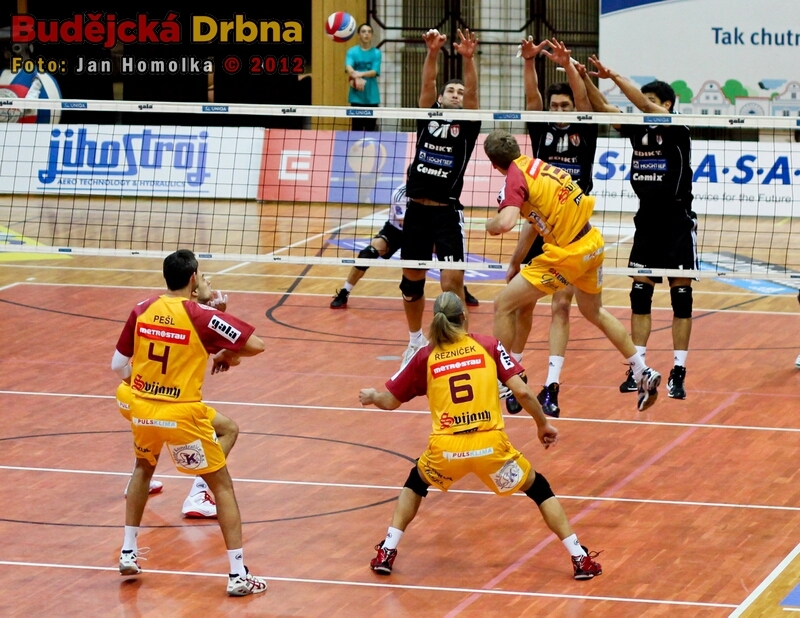 Budějcký univerzál Radek Motys (na bloku zcela vlevo) bude tentokrát proti Liberci chybět