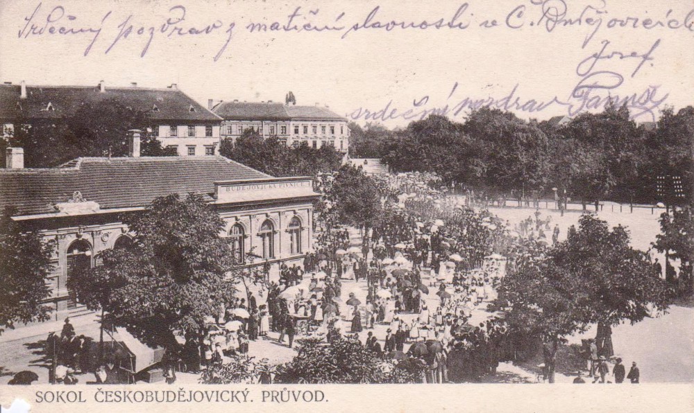 Průvod při Matiční slavnosti před rokem 1908 na Mariánském náměstí a Pražské.