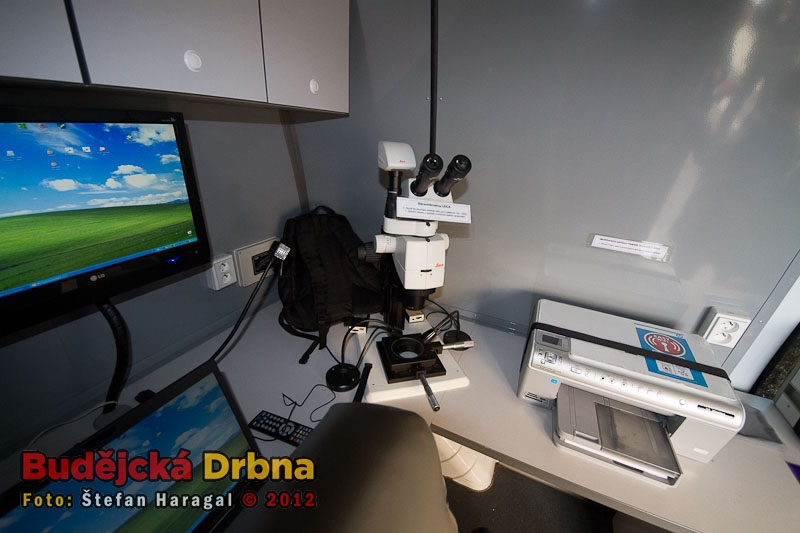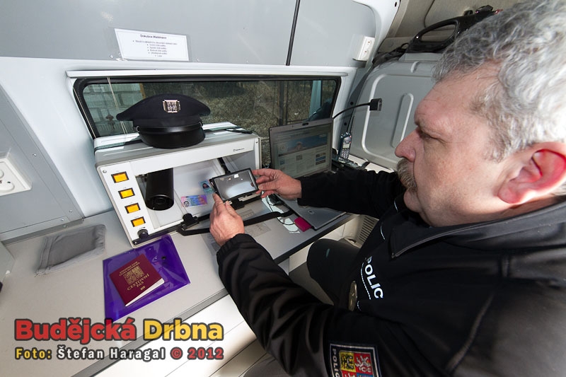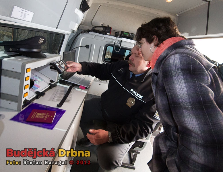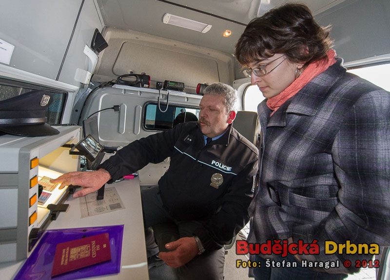 Praporčík Radek Polák předvádí vybavení schengenbusu novinářům