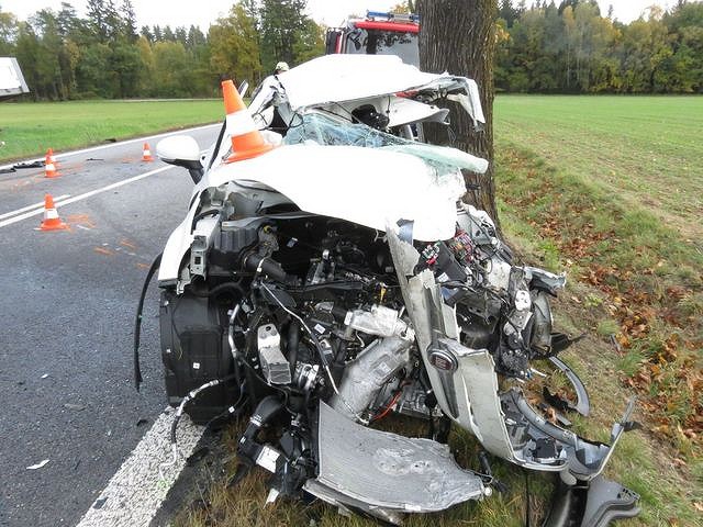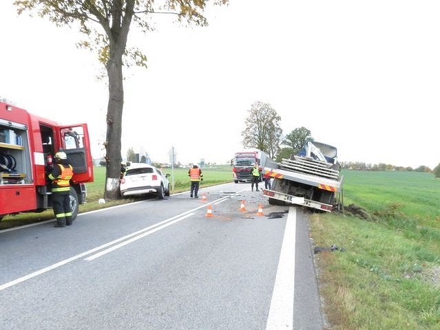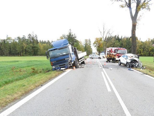 Při srážce osobního auta s náklaďákem u Kaplice se dva lidé těžce zranili.
