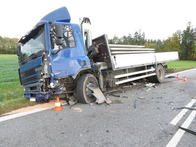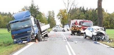 Při srážce osobního auta s náklaďákem u Kaplice se dva lidé těžce zranili.