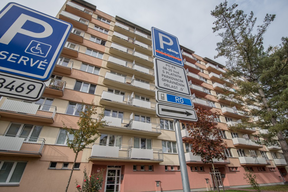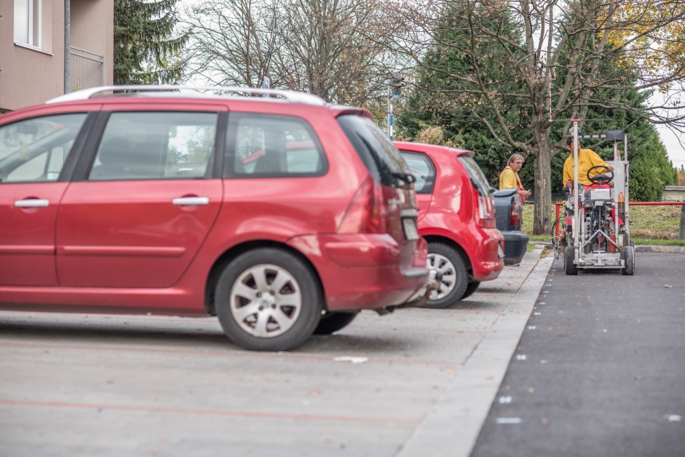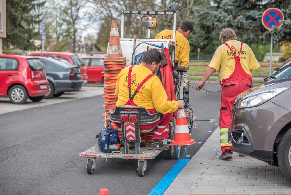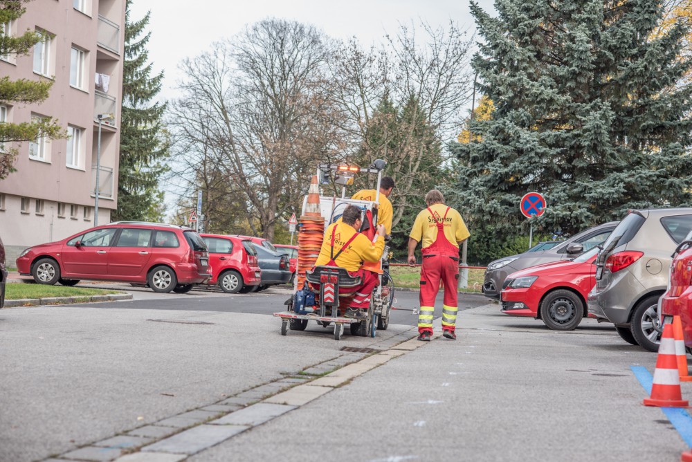 Nové modré parkovací zóny v Českých Budějovicích. Plné ruce práce měli pracovníci firmy s vodorovným značením ještě den před spuštěním nového parkovacího systému.