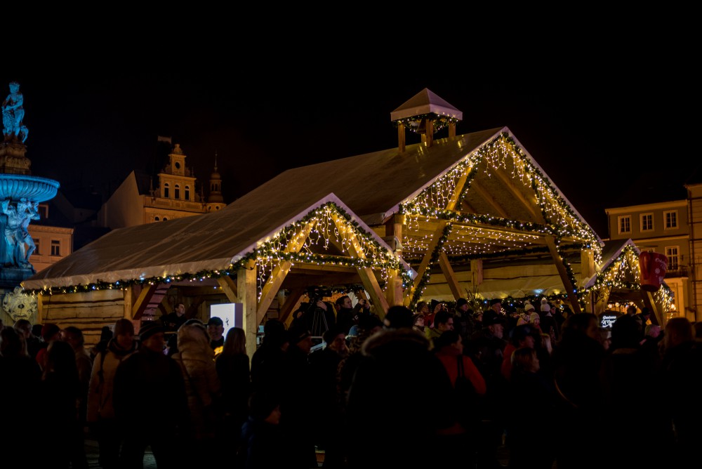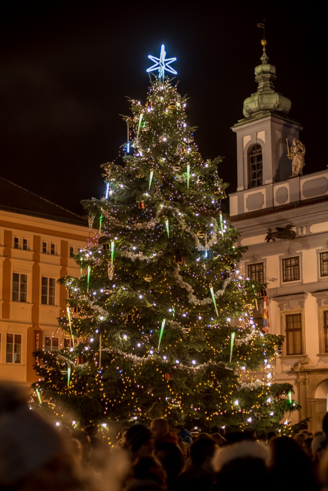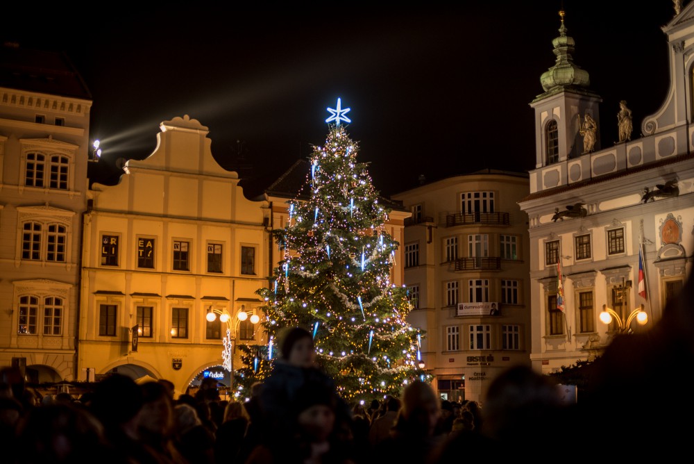 Vánoční strom v Budějcích už září. Jeho slavnostní rozsvícení sledovalo náměstí plné lidí