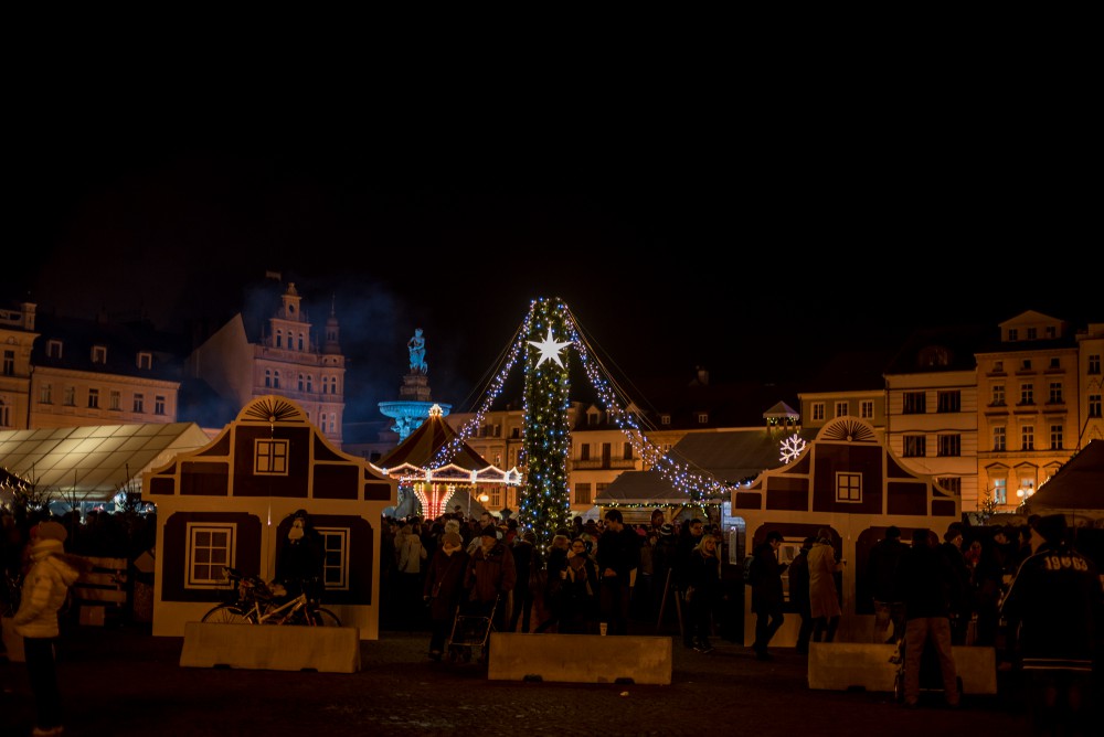 Na budějckém námsětí Přemysla Otakara II. už září nádherný vánoční strom.