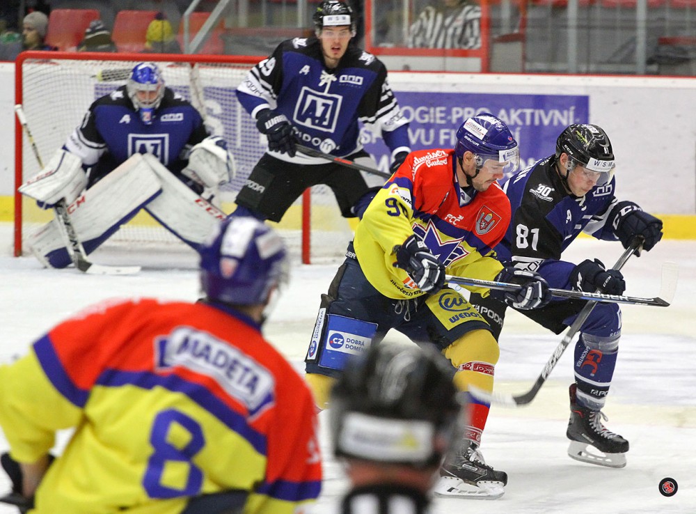 Dobrý výkon v havířovské brance podal budějovický gólman Ondřej Bláha. Na snímku tečujícího Čermáka atakuje Havel